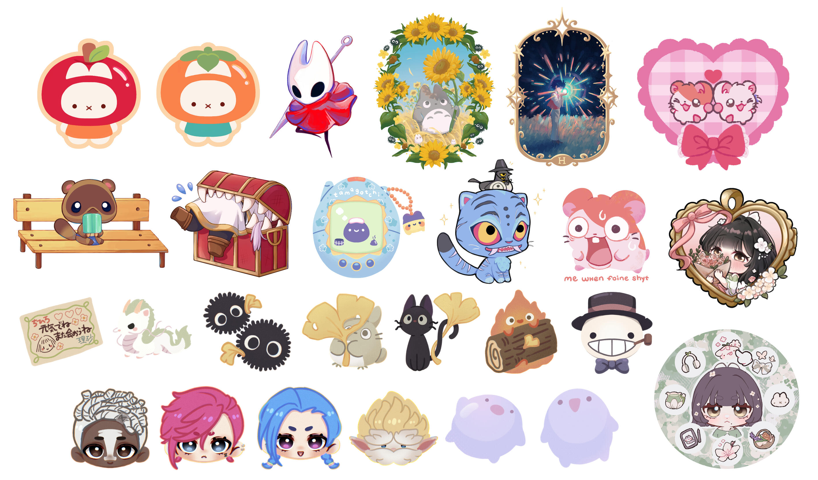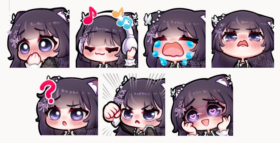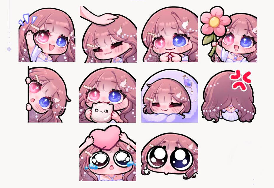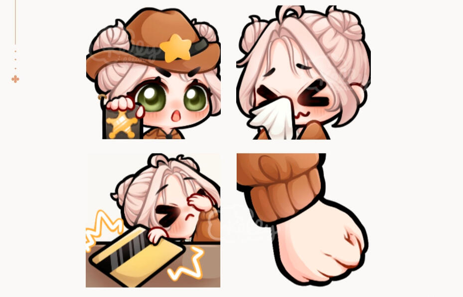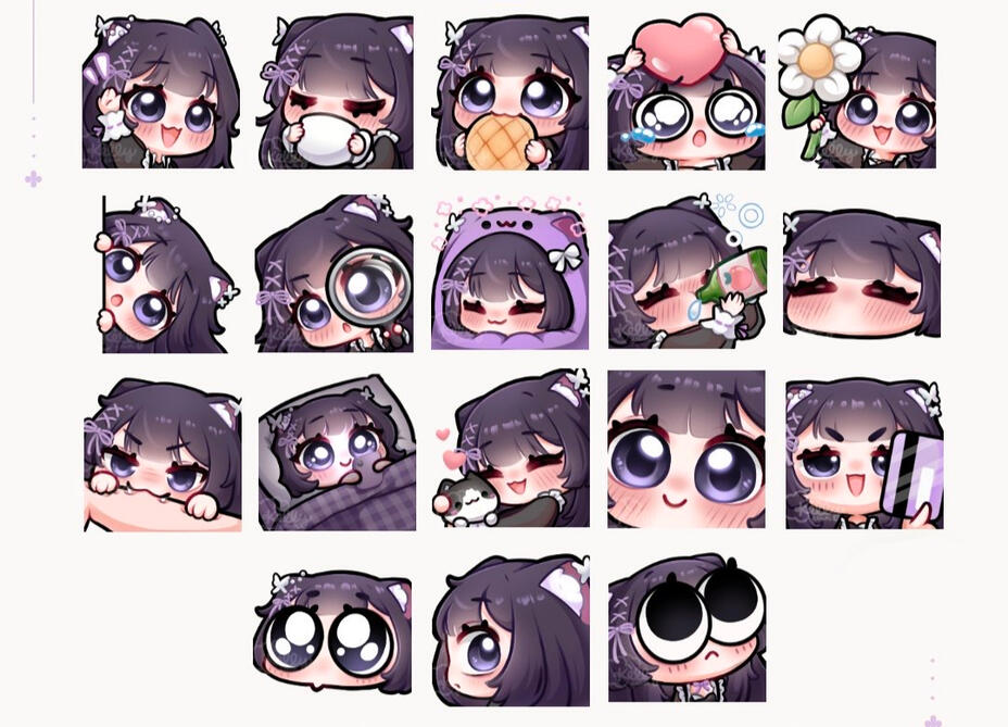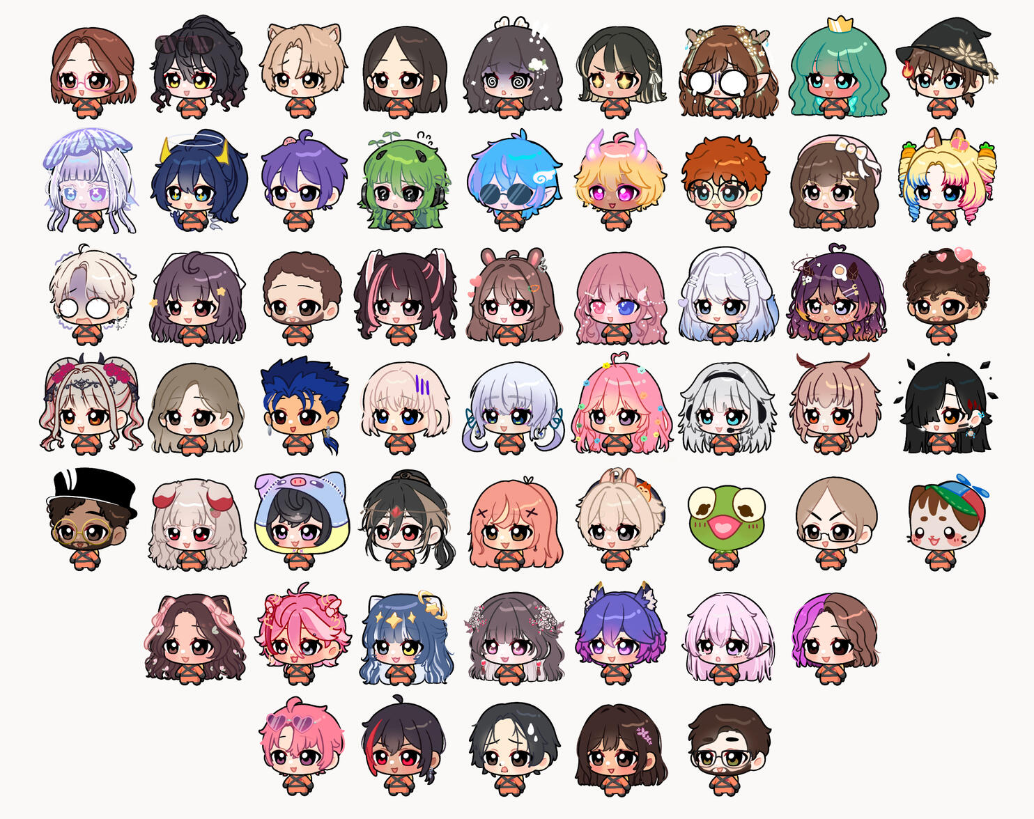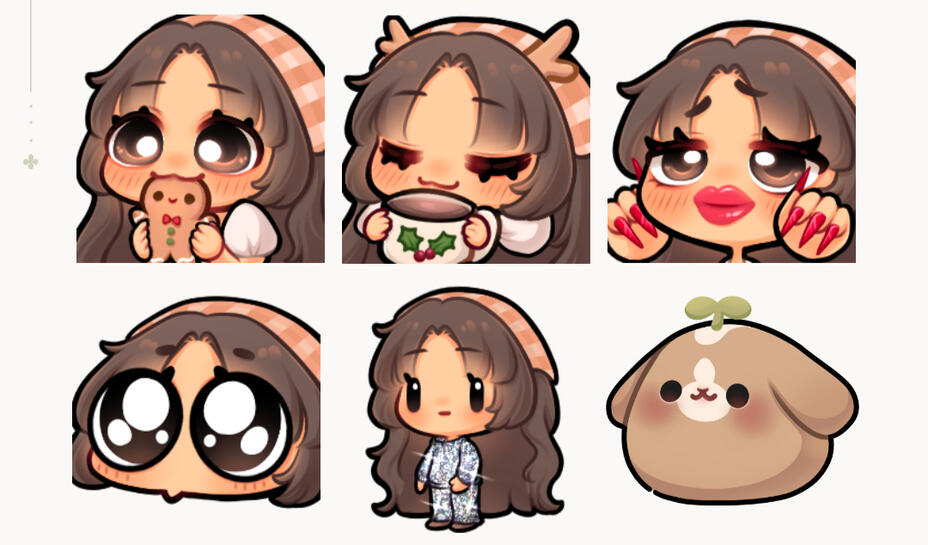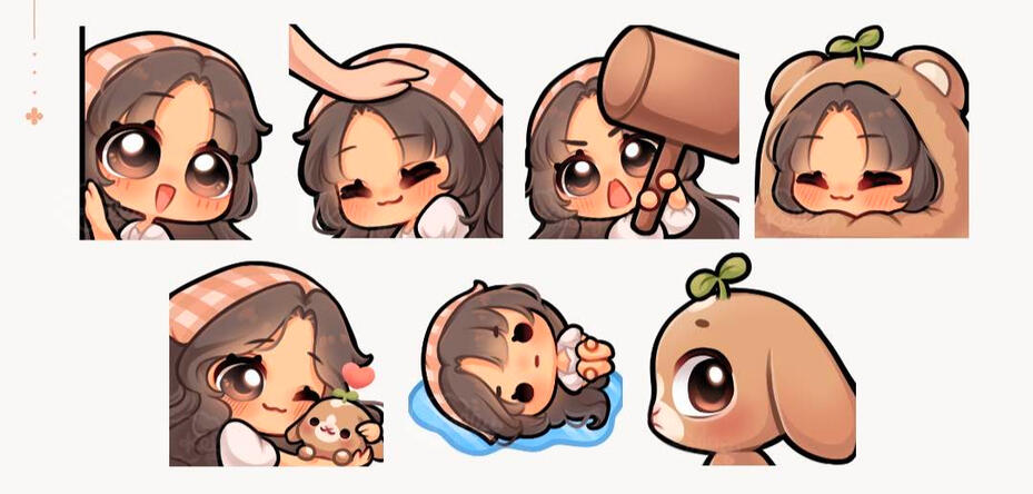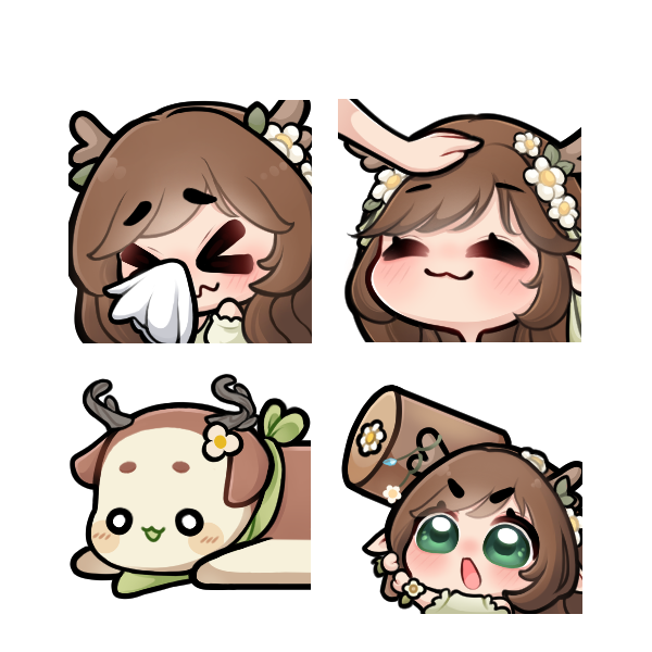 | Five Flower ✿ ✿ ✿ ✿ ✿ | • fully rendered chibi commission • a frame by frame animated emote (simple) • 2 static emote set • a live2d animated emote (simple) |